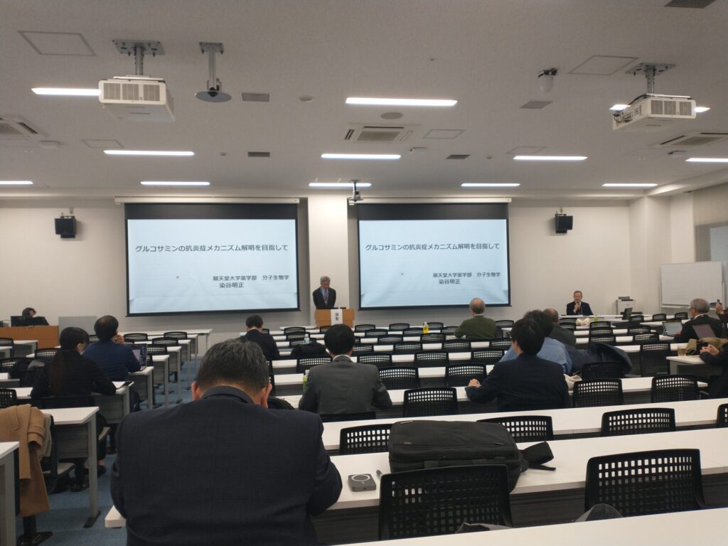 今回のテーマは「機能性食品素材のフロンティアを切り拓く:新規価値創出に向けて」。初日に、大会長の染谷明正氏が「グルコサミンの抗炎症メカニズム解明を目指して」と題し講演した。ヒト滑膜細胞株MH7Aを用いてグルコサミンの炎症抑制効果を検証。グルコサミンが軟骨破壊に関わる酵素の遺伝子や炎症性サイトカイン遺伝子の発現を抑制したことを説明した。